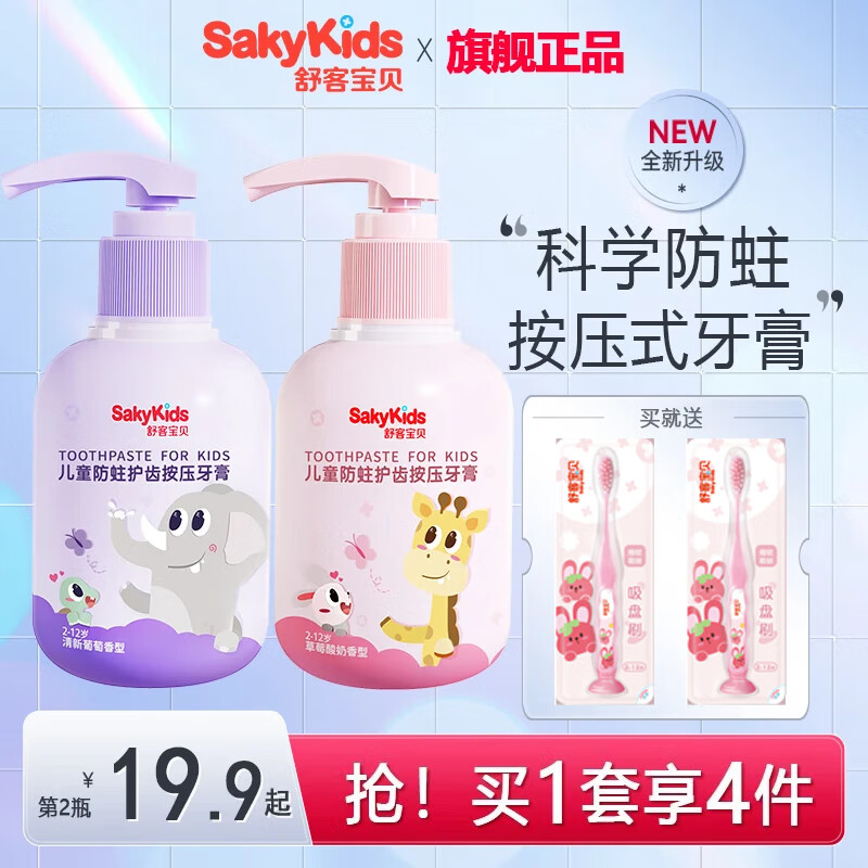 舒客按压式儿童宝宝牙膏含氟防蛀3一6一12岁以上换牙期 按压草莓+按压葡萄 150g 2瓶