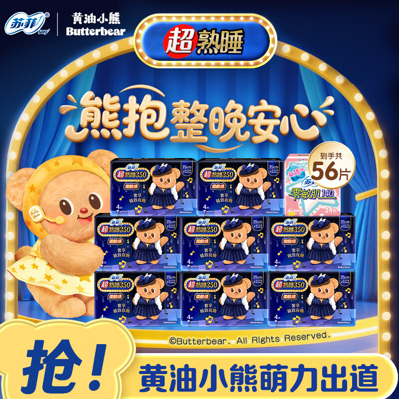 苏菲【黄油小熊联名】卫生巾夜用超熟睡420柔棉感量大姨妈巾旗舰店 夜用组合140+ 350mm 56片
