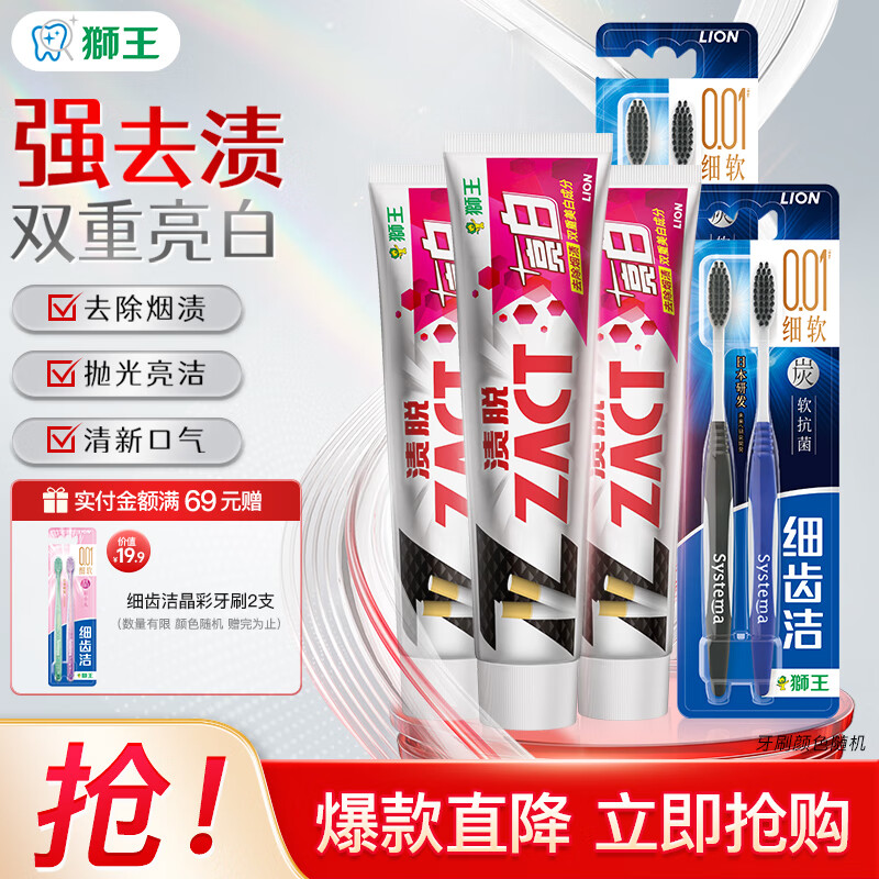 狮王(Lion)LION狮王ZACT渍脱牙膏 专业祛除烟渍 祛除烟渍清新口气亮白牙齿 超亮白牙膏150g*3+炭能量牙刷*4
