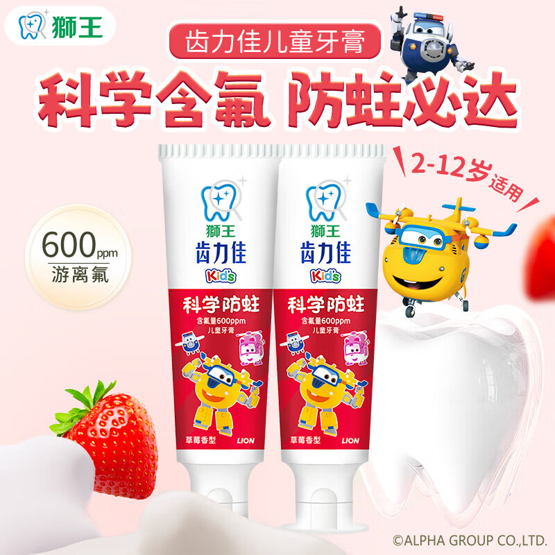 狮王(Lion)齿力佳儿童牙膏果味牙膏 2-12岁 木糖醇含氟牙膏 婴幼儿牙膏 果香型 50g*2支 草莓味