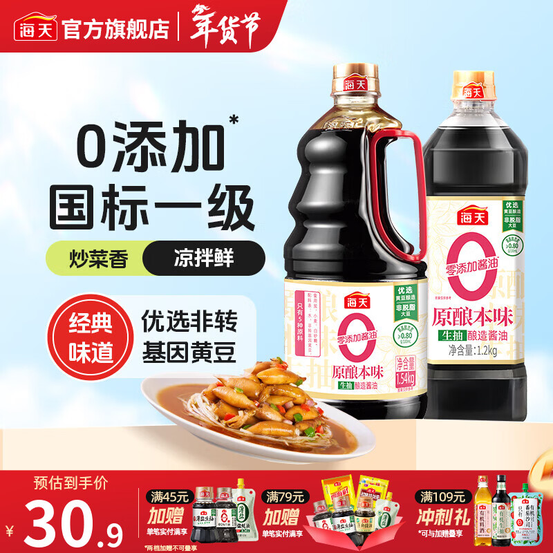 海天酱油 零添加原酿本味1.54kg0添加生抽一级酿造酱油炒菜家用调味品 原酿本味2.74kg(1.54kg+1.2kg)