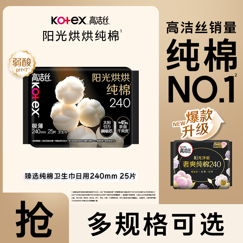 高洁丝【纯棉】卫生巾姨妈巾女超薄臻选棉柔日夜用组合套装整箱阳光烘烘 臻选日用240mm25片单包