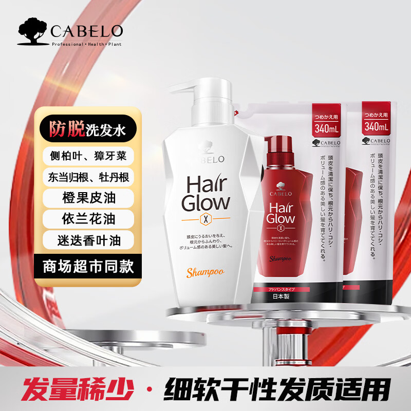 卡蓓诺(CABELO)丰盈润养防脱洗发水 焕活头皮发丝 细软干性发质适用【日本进口】 【防脱固发】润养洗发水350ml+强韧洗发水340ml*2袋