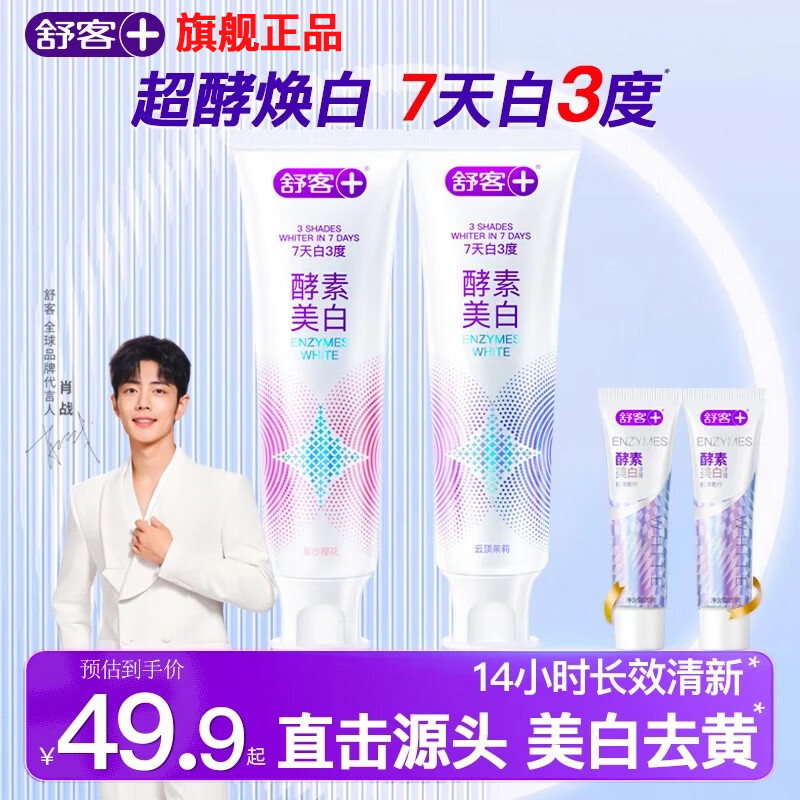 舒客美白色修酵素牙膏去黄去牙渍清新口气成人含氟去烟茶渍防蛀正品 樱花+茉莉 120g*2支