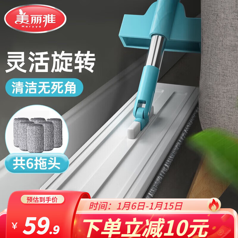 美丽雅推水平板拖把免手洗懒人拖把挤水拖布墩布家用拖地神器干湿两用 38CM 共6拖布
