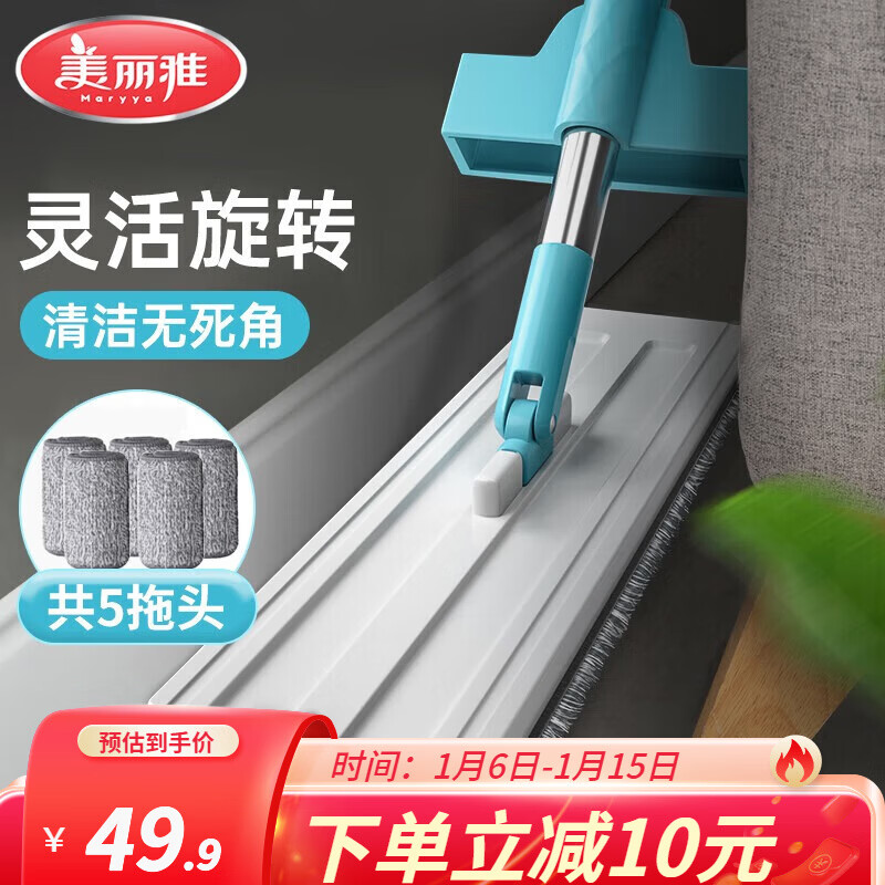美丽雅推水平板拖把免手洗懒人拖把挤水拖布墩布家用拖地神器干湿两用 38CM 共5拖布