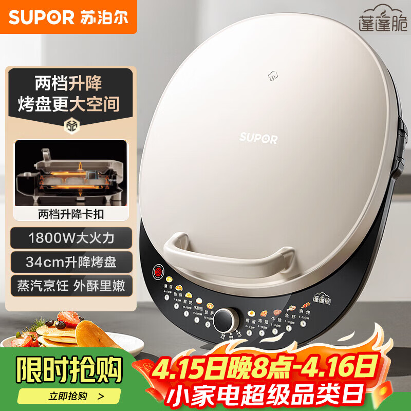 苏泊尔(SUPOR)电饼铛家用 双面加热 煎烤机烙饼锅煎饼铛36mm加深34cm加大升降烤盘 早餐机电饼档 JT34AQ876