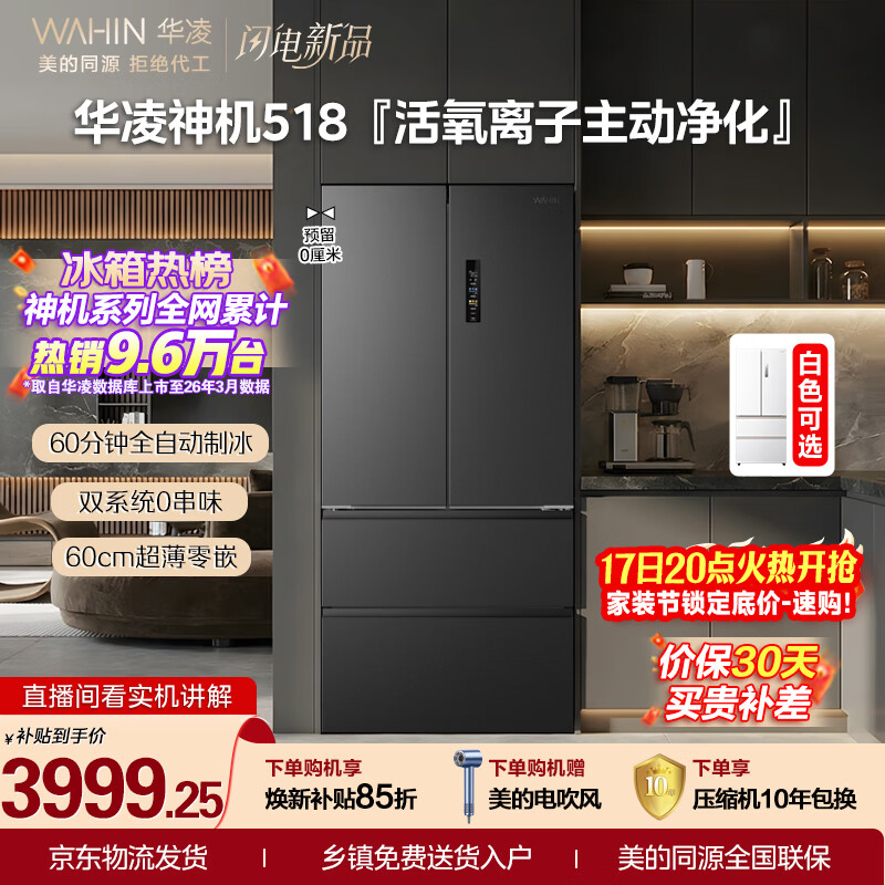 华凌美的出品神机518L法式多门冰箱自动制冰双系统主动净化超薄零嵌大容量HR-518WUFIPZ国家补贴雾隐黛