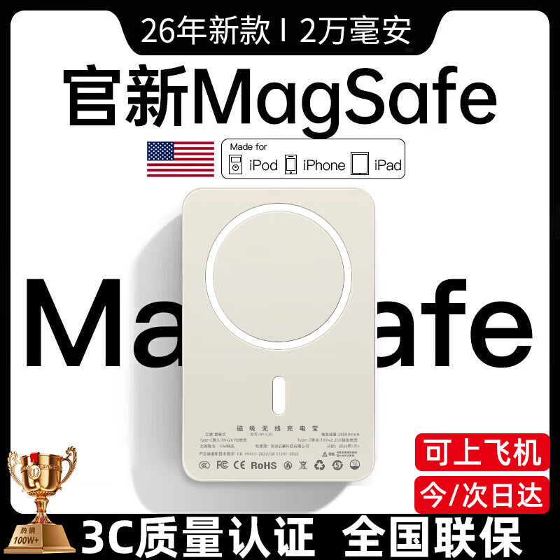 嘉柏兰【国家3C认证丨20000毫安】MagSafe磁吸充电宝移动电源20W超级快充超薄迷你便携无线适用苹果华为 【Pro版20000毫安】国家3C认证丨可上飞机 全系通用丨高品质电芯丨当日次日达