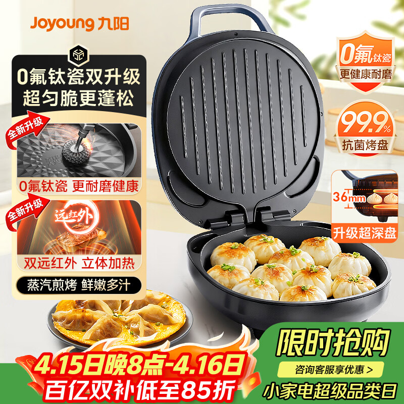 九阳(Joyoung)【升级0氟】家用电饼铛三明治机早餐机 36mm加深烤盘煎烤机 双面加热 大火力蒸汽烤肉饼铛GK128