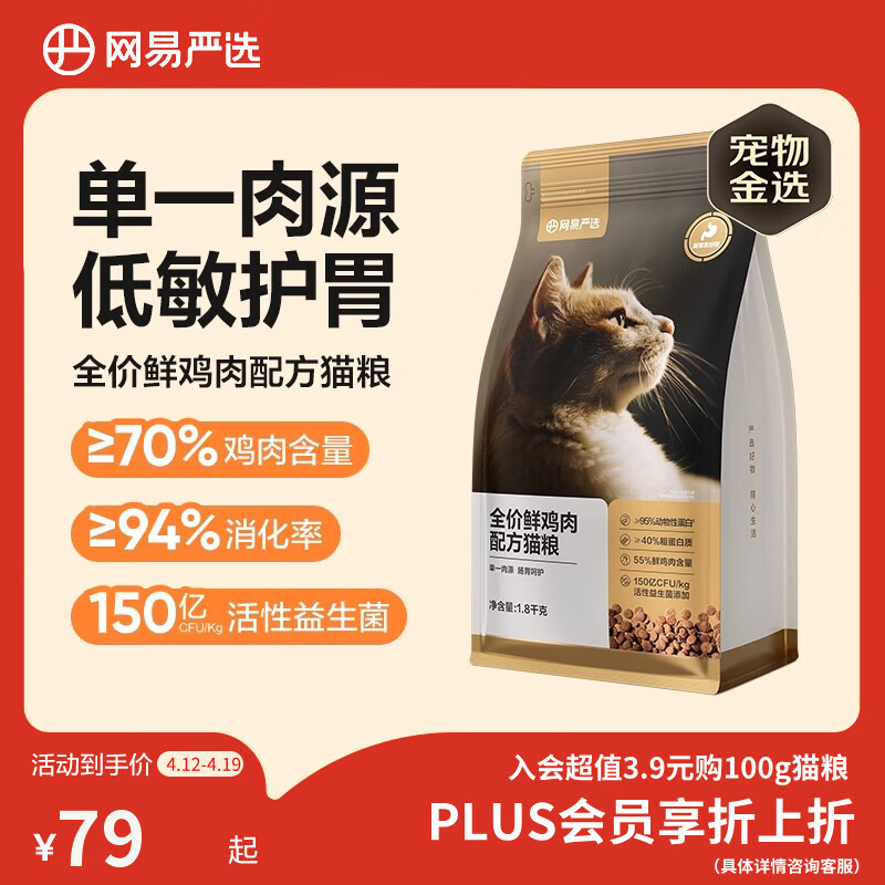网易严选全价鲜鸡肉猫粮 成幼猫粮单一肉源无谷益生菌低敏护肠胃增肌1.8kg