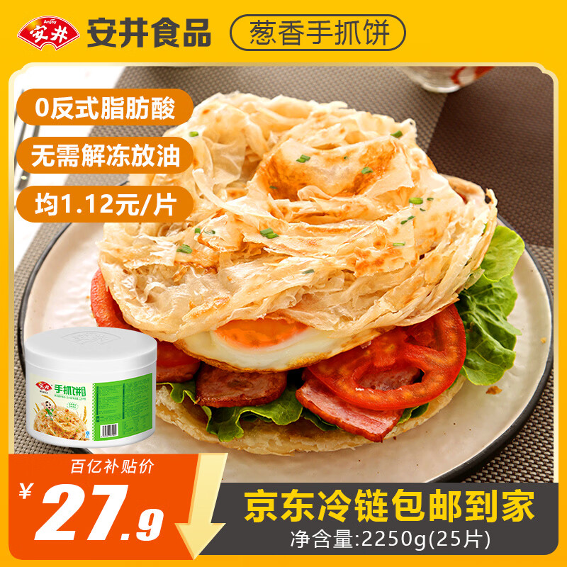 安井桶装手抓饼 葱香味 2250g 25片 家庭装葱油饼煎饼 速食早餐面点