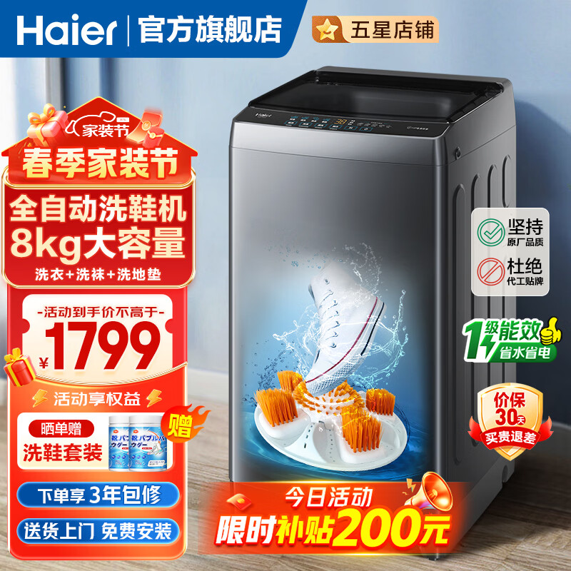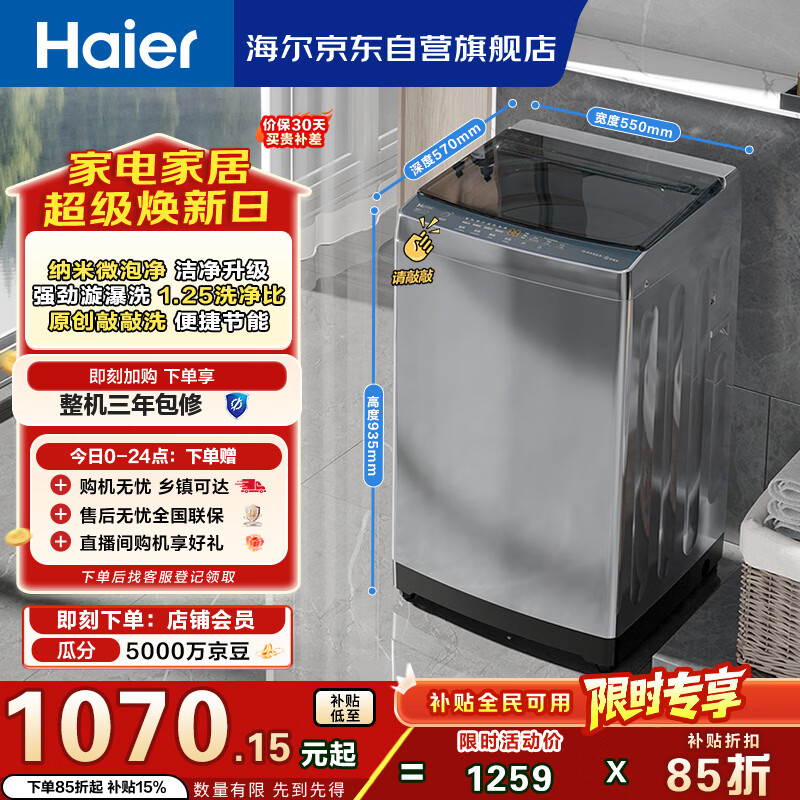 海尔(Haier)全自动波轮洗衣机 10KG 超薄 变频一级能效 超薄 家电国家补贴以旧换新京东自营 XQB100-BZ20D0