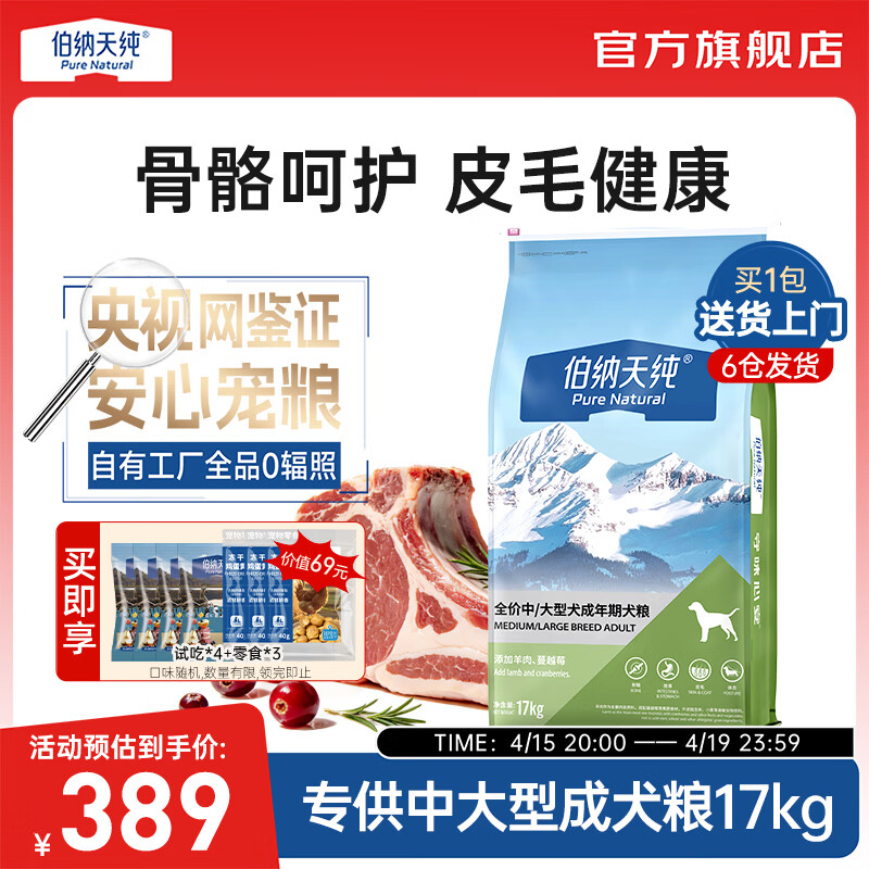 伯纳天纯经典优选狗粮中大小型全价通用呵护骨骼皮毛健康专供款 中大型成犬粮17kg羊肉蔓越莓味+享试吃50g