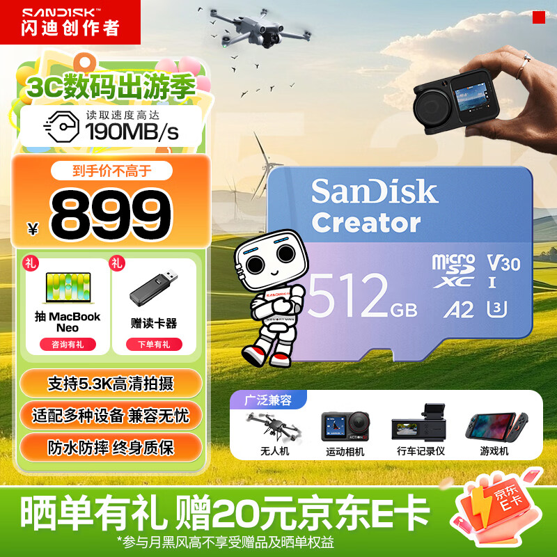 闪迪(SanDisk)创作者 闪迪内存卡TF卡 行车记录仪运动相机无人机监控存储卡 运动相机大疆pocket3/4内存卡 V30极速粉卡 512GB 官方标配