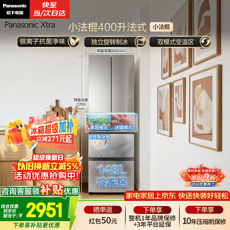 松下(Panasonic)Xtra小法棍400L法式多门冰箱家用小户型超薄风冷无霜以旧换新星际银NR-XG41PEB-S【国家补贴】