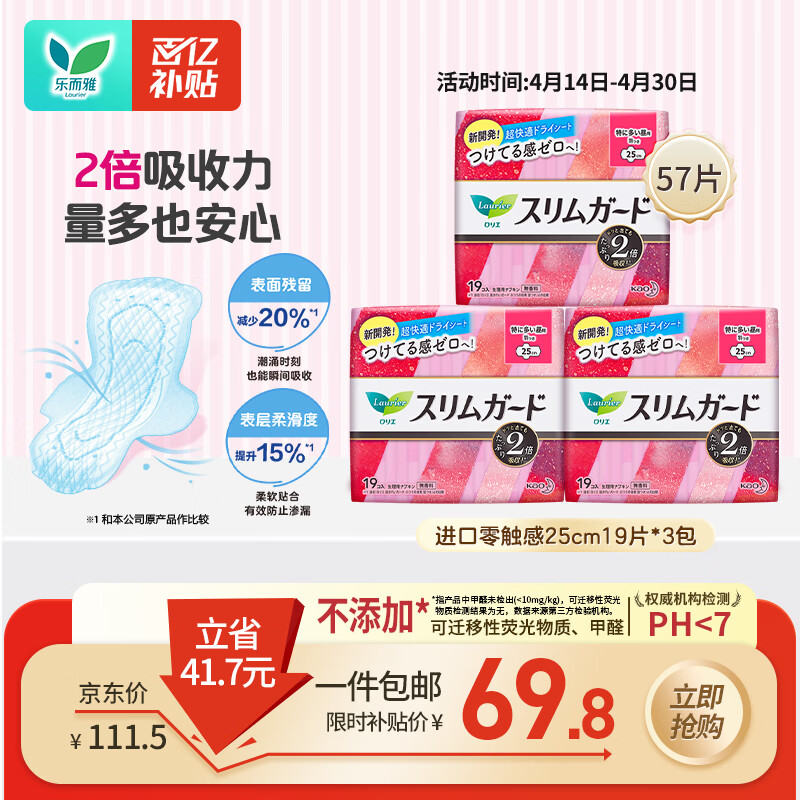 乐而雅花王进口零触感特薄超长量特多日用卫生巾25cm19片*3共57片姨妈巾