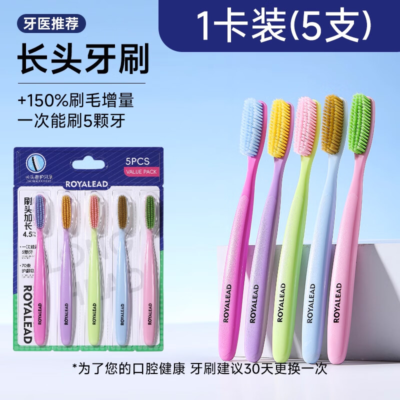RAOYI加长头牙刷成人护龈软毛牙刷懒人清洁力增强牙刷男女士情侣家庭装 长头加大牙刷 5支
