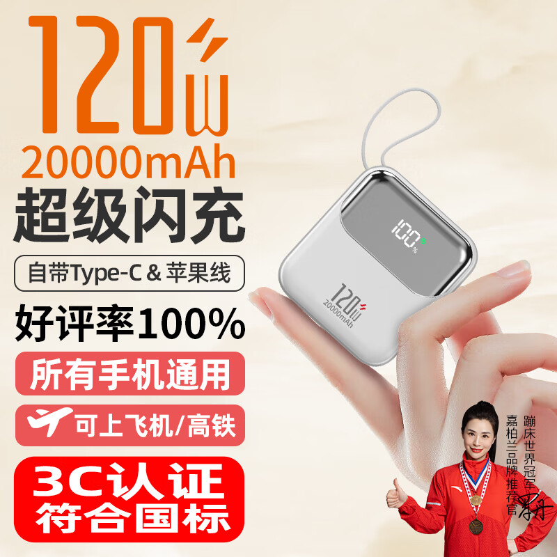 嘉柏兰【国家3C认证丨20000毫安】充电宝适用小米120W超级快充大容量可上飞机自带线移动电源小巧便携 【尊享版2万毫安】自带双线+120W超级快充