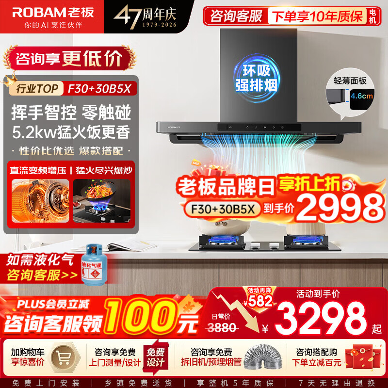 老板(Robam)【升级款F30】60A0S油烟机燃气灶套装 家用欧式顶吸抽油烟机灶具 直流变频巡航24大风量烟灶套装 【94%人选择】F30+5.2kw猛火灶30B5X