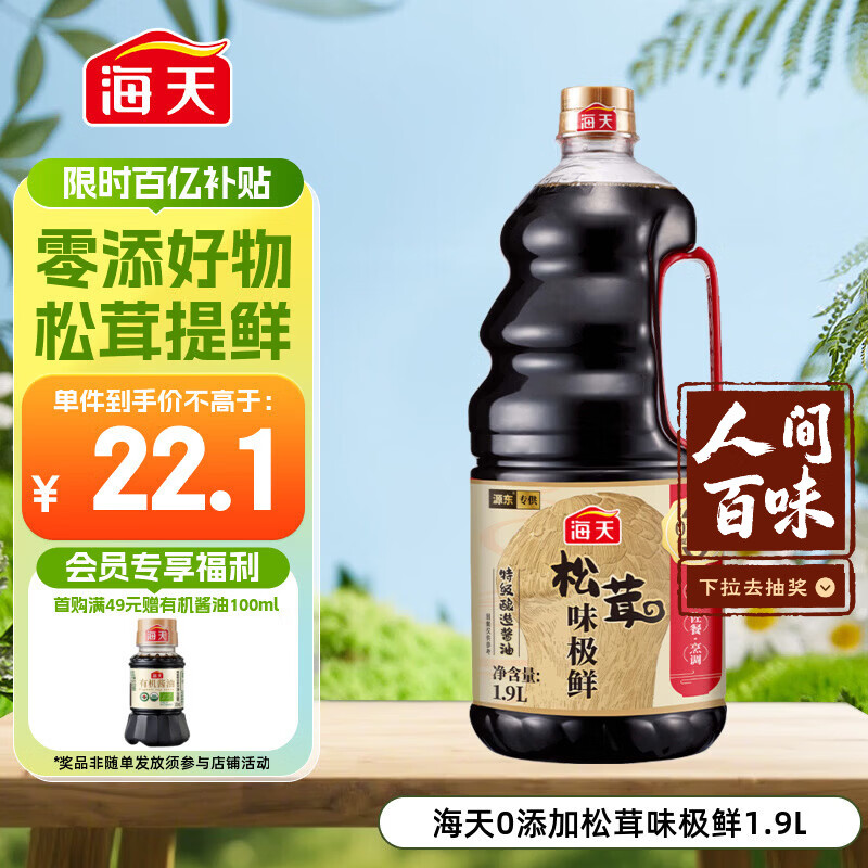 海天 生抽酱油 0添加松茸味极鲜1.9L【特级酱油松茸提鲜】味极鲜系列