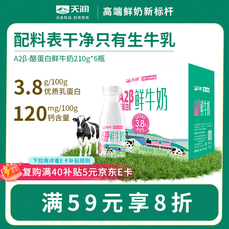 天润 新疆产地 A2β-酪蛋白鲜奶 巴氏杀菌鲜牛奶210g*6瓶【京东专供】