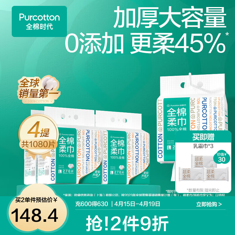 全棉时代【孙颖莎同款】悬挂式一次性100%棉洗脸巾壁挂式洁面巾抽取棉柔巾 【经典悬挂款】 270片*4提