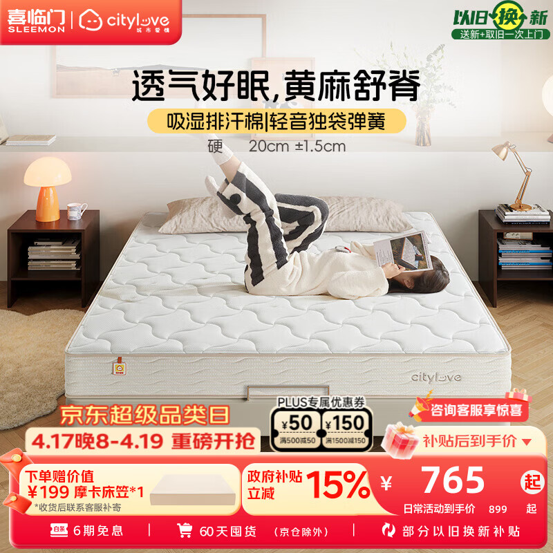 城市爱情喜临门床垫 偏硬0胶黄麻床垫独立弹簧双人硬床垫子席梦思大白垫H2 大白H2(偏硬款 黄麻舒脊) 1.2*2.0米