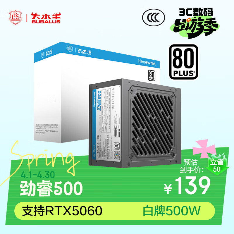 大水牛(BUBALUS)额定500W 劲睿500台式电脑主机电源(80PLUS白牌认证/主动式PFC/12CM温控风扇/支持背线/宽幅)