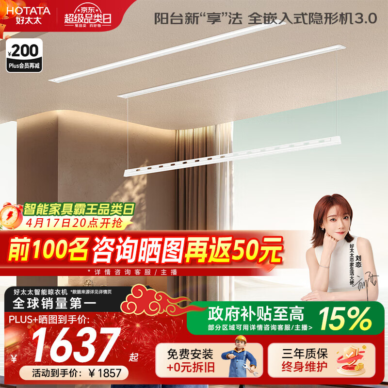 好太太隐形晾衣架电动晾衣机隐藏式自动智能升降阳台嵌入式晒衣架 D-3202:1.5米双杆被杆+照明