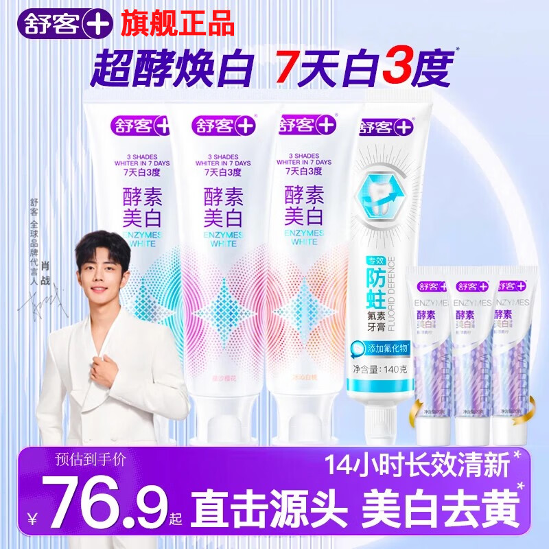 舒客酵素美白牙膏去黄清新口气含氟防蛀男女生专用非去口臭官方正品 樱花+蜜桃+青柠+防蛀 120g*4支 +酵素20g*3支