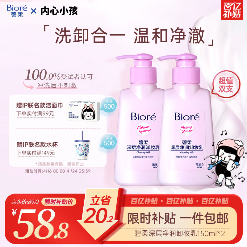 碧柔(Biore)深层净润卸妆乳150ml*2洁面二合一温和清洁敏感肌可用护肤品