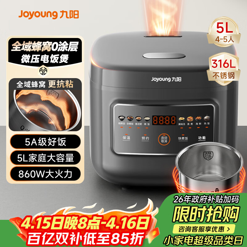 九阳(Joyoung)【全域蜂窝0涂层】316L不锈钢内胆电饭煲电饭锅5升大容量4-6人860W微压烹饪5A级米饭 F-50F505L