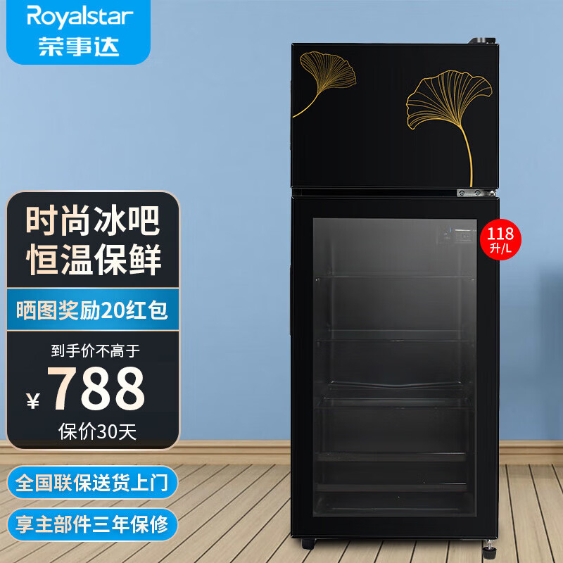 荣事达(Royalstar)冰吧冷藏柜 欧式恒温红酒柜酒店家用客厅冰箱迷你小型单门办公室保鲜展示留样茶叶饮料柜 双门118L【下冷藏+上冷冻+蓝光灯】