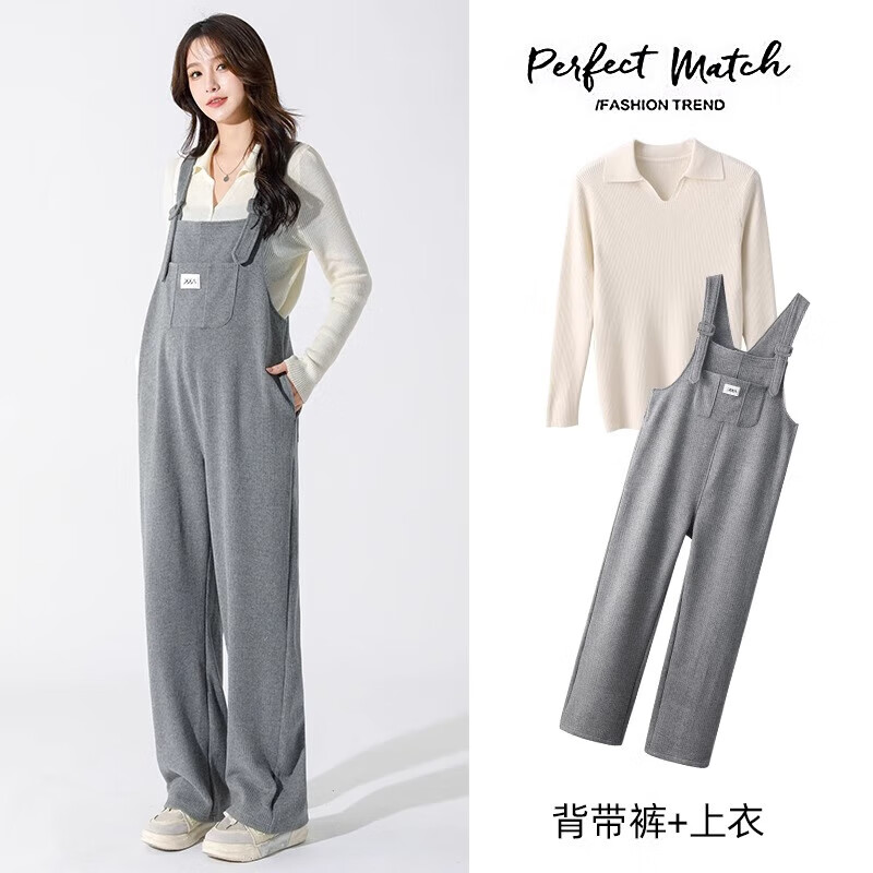 米度丽孕妇背带裤套装秋冬加绒加厚孕妇裤子冬季外穿阔腿裤秋季长裤冬装 深灰色背带裤+杏色毛衣 M码(建议80-110斤左右)