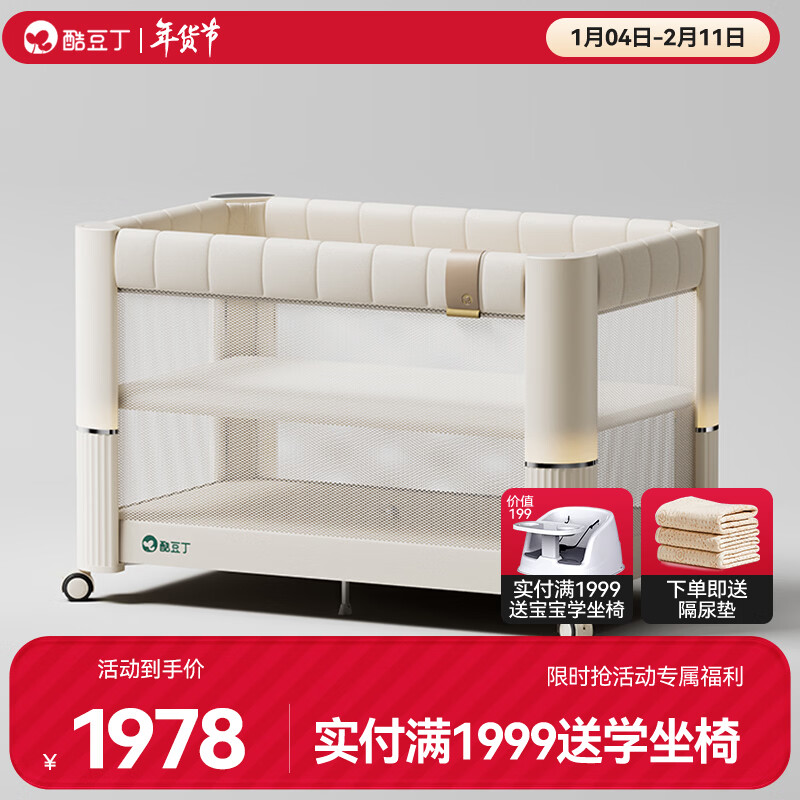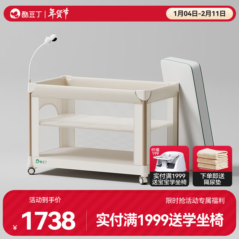 酷豆丁婴儿床多功能智能折叠拼接大床便携可移动新生婴儿床宝宝床 床+看护器+智能App+4D纤维床垫