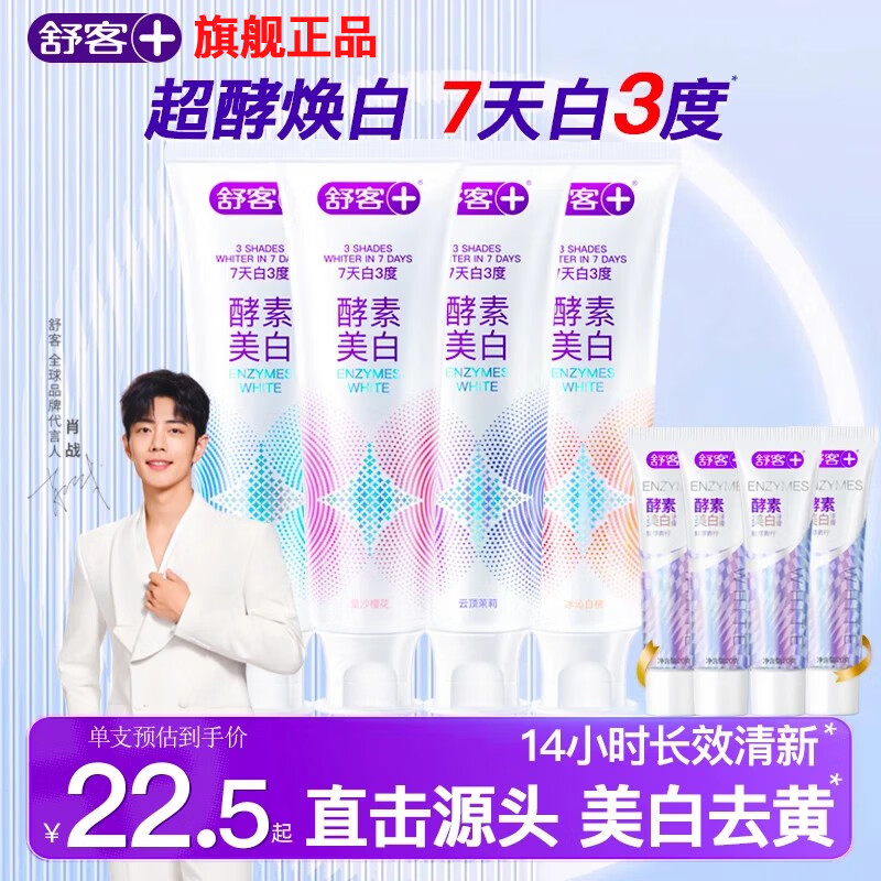 舒客酵素美白牙膏去黄清新口气含氟防蛀男女生专用非去口臭官方正品 樱花+白桃+青柠+茉莉 120g*4支 +酵素20g*4支