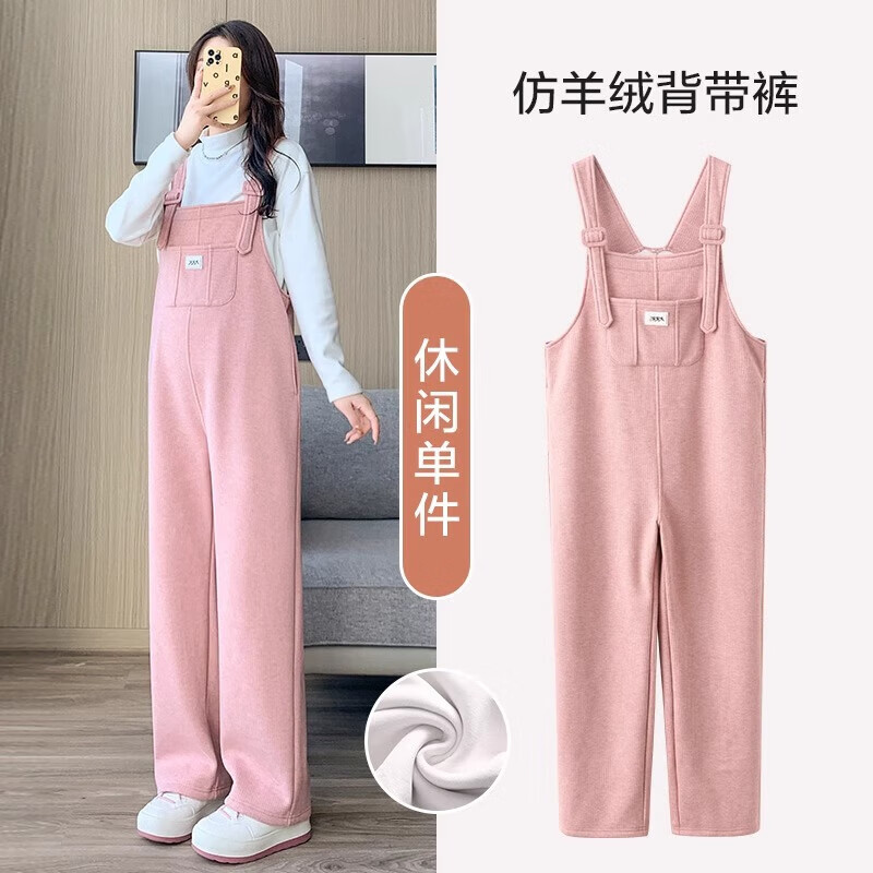 米度丽孕妇背带裤套装秋冬加绒加厚孕妇裤子冬季外穿阔腿裤秋季长裤冬装 粉色背带裤-加绒 L码(建议100-140斤左右)