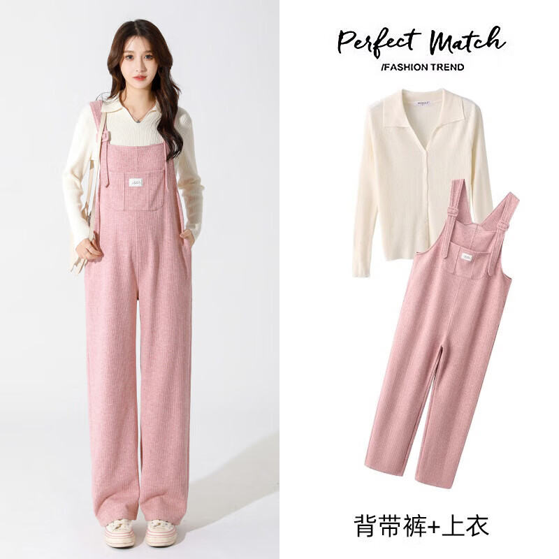 米度丽孕妇背带裤套装秋冬加绒加厚孕妇裤子冬季外穿阔腿裤秋季长裤冬装 粉色背带裤+杏色毛衣 XL码(建议130-160斤左右)