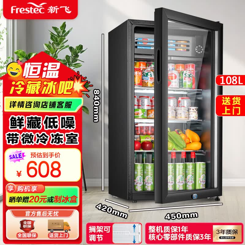 新飞 (Frestec)冰吧冷藏柜保鲜柜 欧式恒温红酒柜酒店家用客厅冰箱迷你小型单门办公室保鲜展示留样茶叶饮料柜 108升黑内胆【冷藏+微冷冻+带灯+带锁】