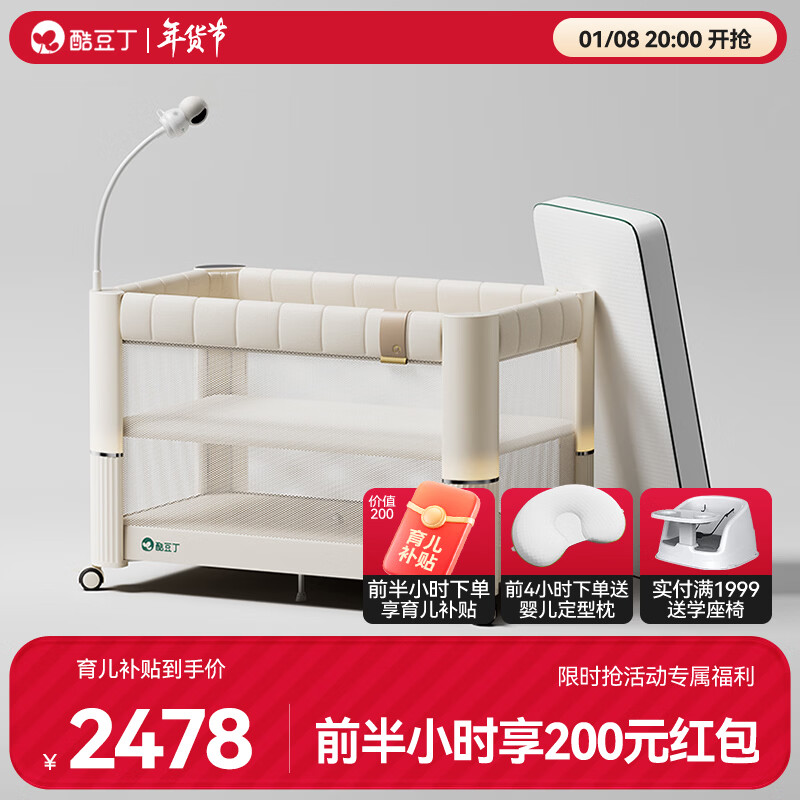 酷豆丁云朵智能哄睡婴儿床折叠拼接大床可移动新生婴儿床宝宝床床 云朵床+4D纤维床垫+摄像头