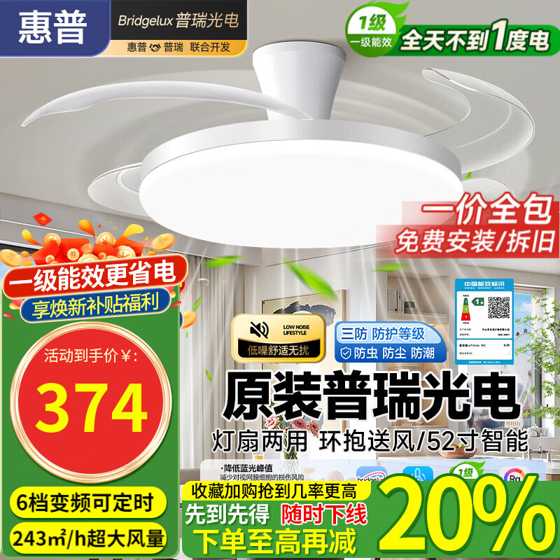 惠普风扇灯普瑞护眼LED隐形扇叶餐厅卧室遥控调光一体无叶吊扇灯中山 1级能效/吸顶52寸普瑞光/喵喵精灵