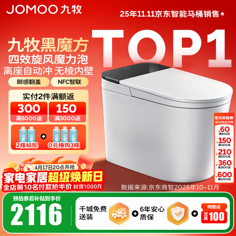 九牧(JOMOO)轻智能马桶家用无水压限制无棱内壁坐厕NFC智控黑魔方虹吸坐便器 旋风魔力泡【免触翻盖翻圈】SQ9650 400坑距(390以上选择)