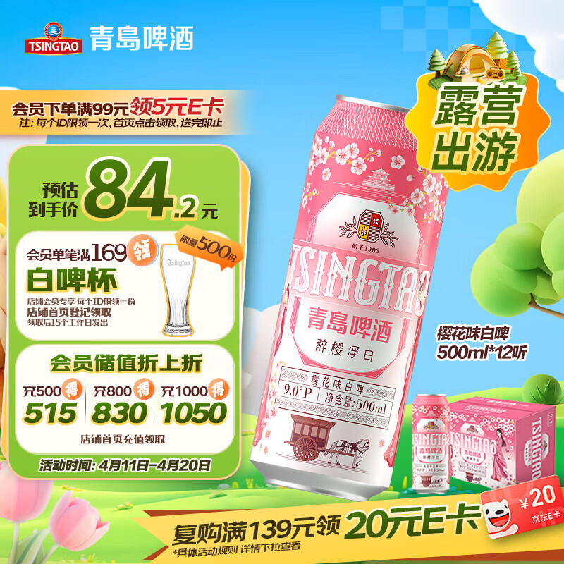 青岛啤酒(TsingTao)樱花味白啤 500ml*12听 整箱装踏春送礼