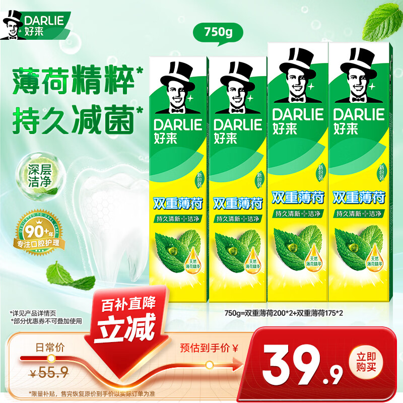 好来(原黑人)热销榜双重薄荷牙膏清新防蛀固齿护龈含氟4支750g