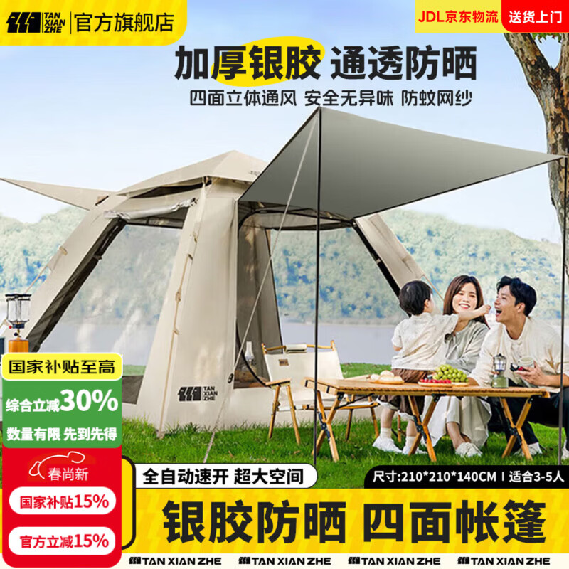 探险者(TAN XIAN ZHE)帐篷户外露营防雨过夜3人-4人速开便捷天幕二合一黑胶防晒帐篷 3-5人加厚防晒帐篷【云雾白】