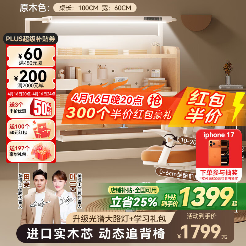 童博士儿童学习桌椅套装实木可升降写字桌小学生书桌课桌椅子阳光桌C12 1米实木桌+光谱大路灯+追背椅 赠学习大礼包
