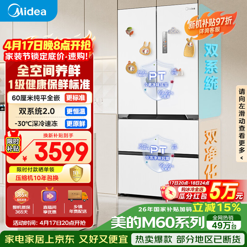 美的(Midea)536法式四开门冰箱511L大容量超薄嵌入式双系统一级能效风冷无霜以旧换新白MR-536WUFPZE国家补贴