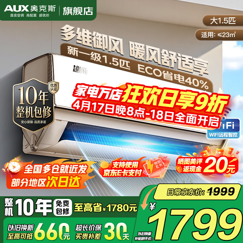 奥克斯(AUX)家电补贴15%空调1匹/1.5匹新一级/三级能效变频空调节能省电卧室壁挂式空调挂机以旧换新 大1.5匹 一级能效【手机智控】御风