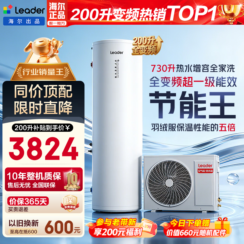海尔(Haier)国家补贴空气能电热水器包安装 双变频一级节能200升/300升80℃家用商用统帅空气源电辅热泵热水器 M2【200升双变频】全能省电王/销量第一 变频